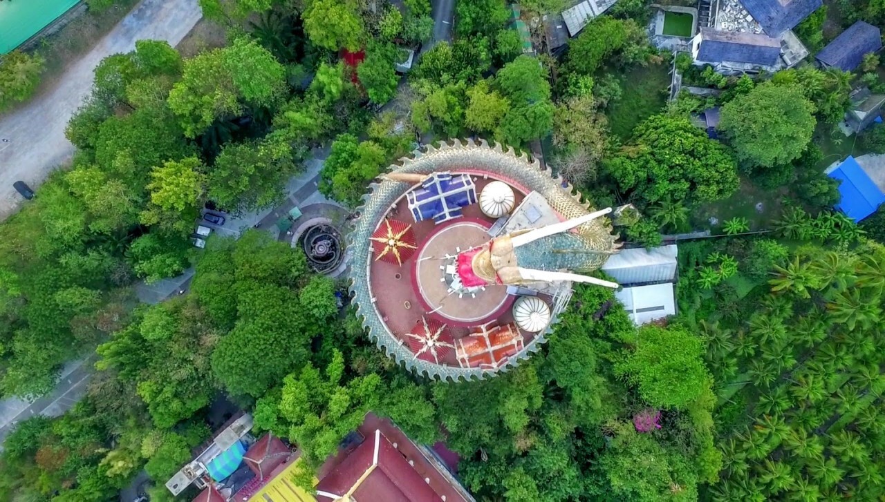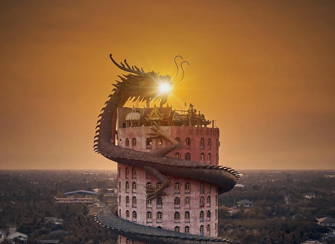 Завершает день Ват Сампхран в провинции Накхонпатхом — та самая розовая башня высотой восемьдесят метров, которую от основания до самой крыши обвивает гигантский зелёный дракон. Внутри дракона спрятана винтовая лестница — по ней можно подняться через все семнадцать этажей на вершину с панорамным видом на округу. Каждый этаж символизирует один из небесных уровней буддийской космологии, а сам дракон — путь человека от страдания к просветлению.