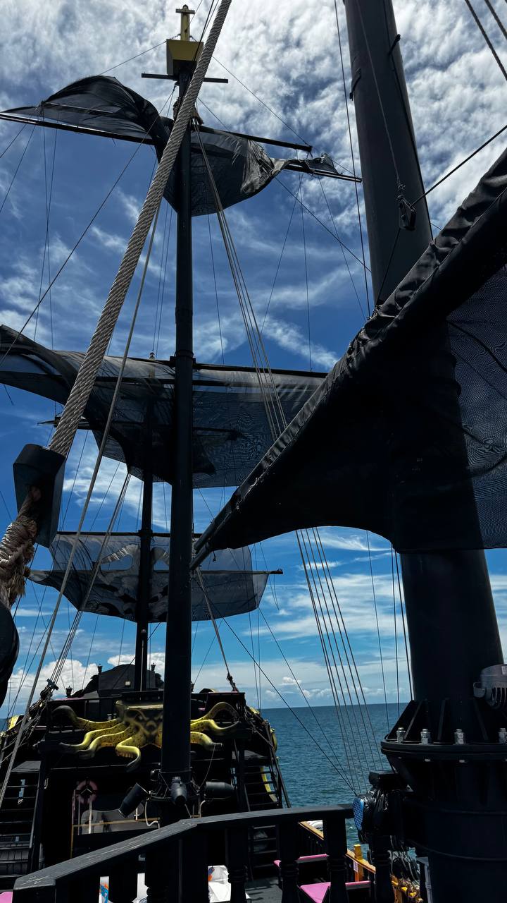 Это стилизованный прогулочный корабль с пиратским оформлением — чёрные паруса, деревянная палуба, флаги. Выглядит эффектно и фотогенично.