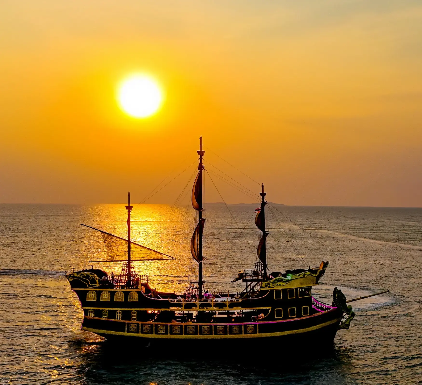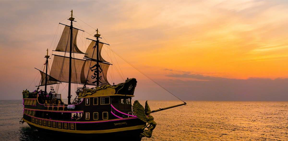 Пиратский корабль отходит от пирса после полудня — чёрные паруса, деревянная палуба, флаг с черепом. На борту уже раздают костюмы и треуголки — к моменту выхода в открытое море половина пассажиров выглядит как экипаж Джека Воробья.