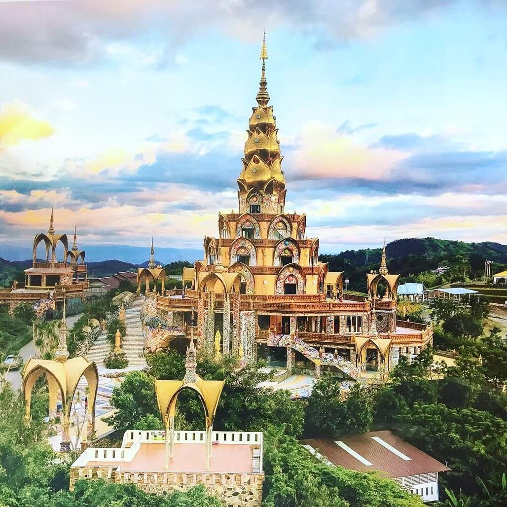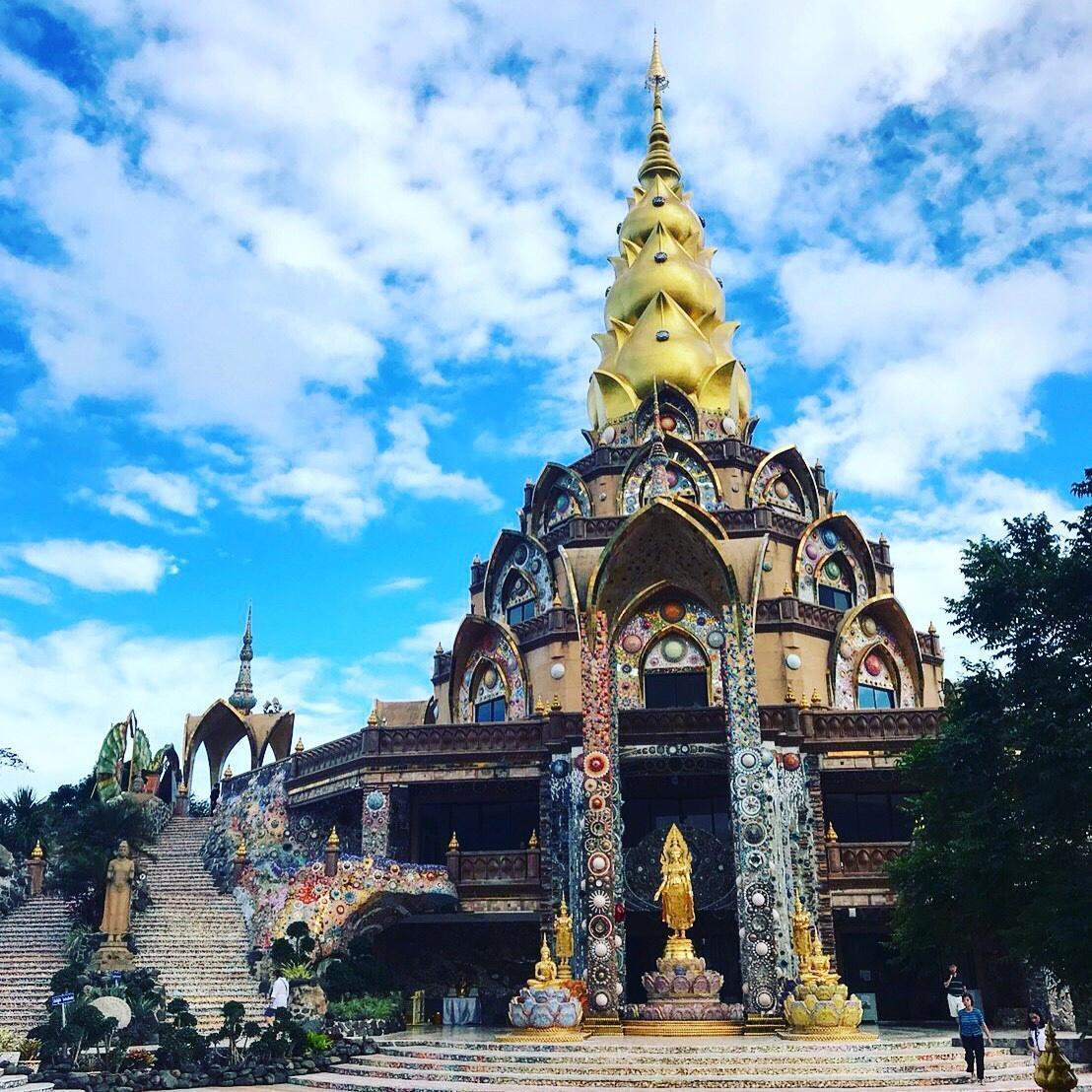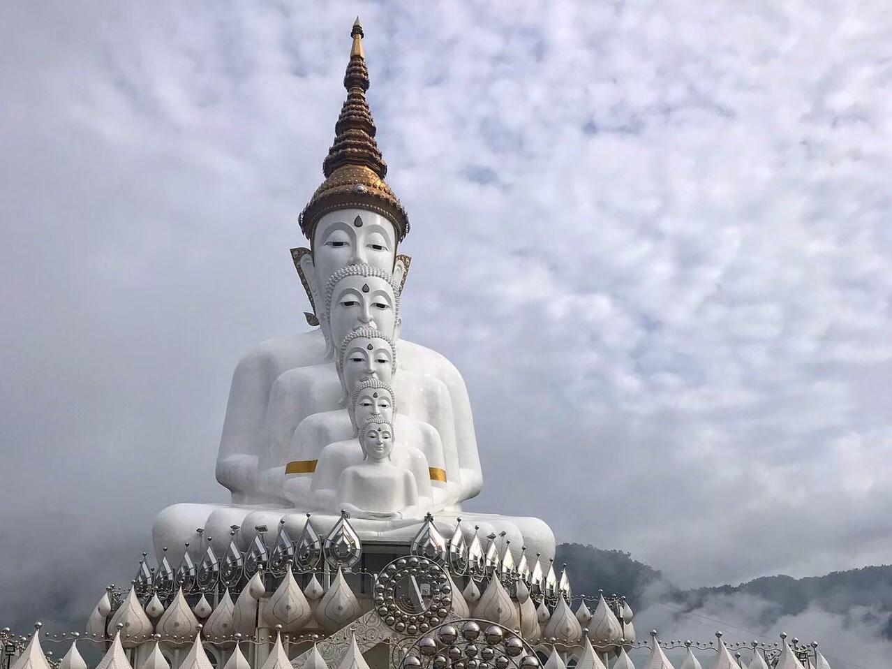Храм Wat Phrathat Pha Sorn Kaew на вершине горы. Стены и ступени покрыты мозаикой из миллионов фрагментов фарфора и цветной керамики. Пятиярусная белая статуя Будды видна издалека.