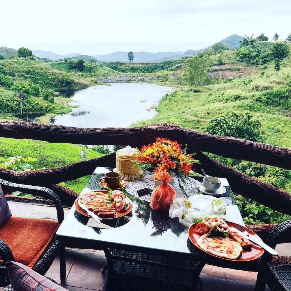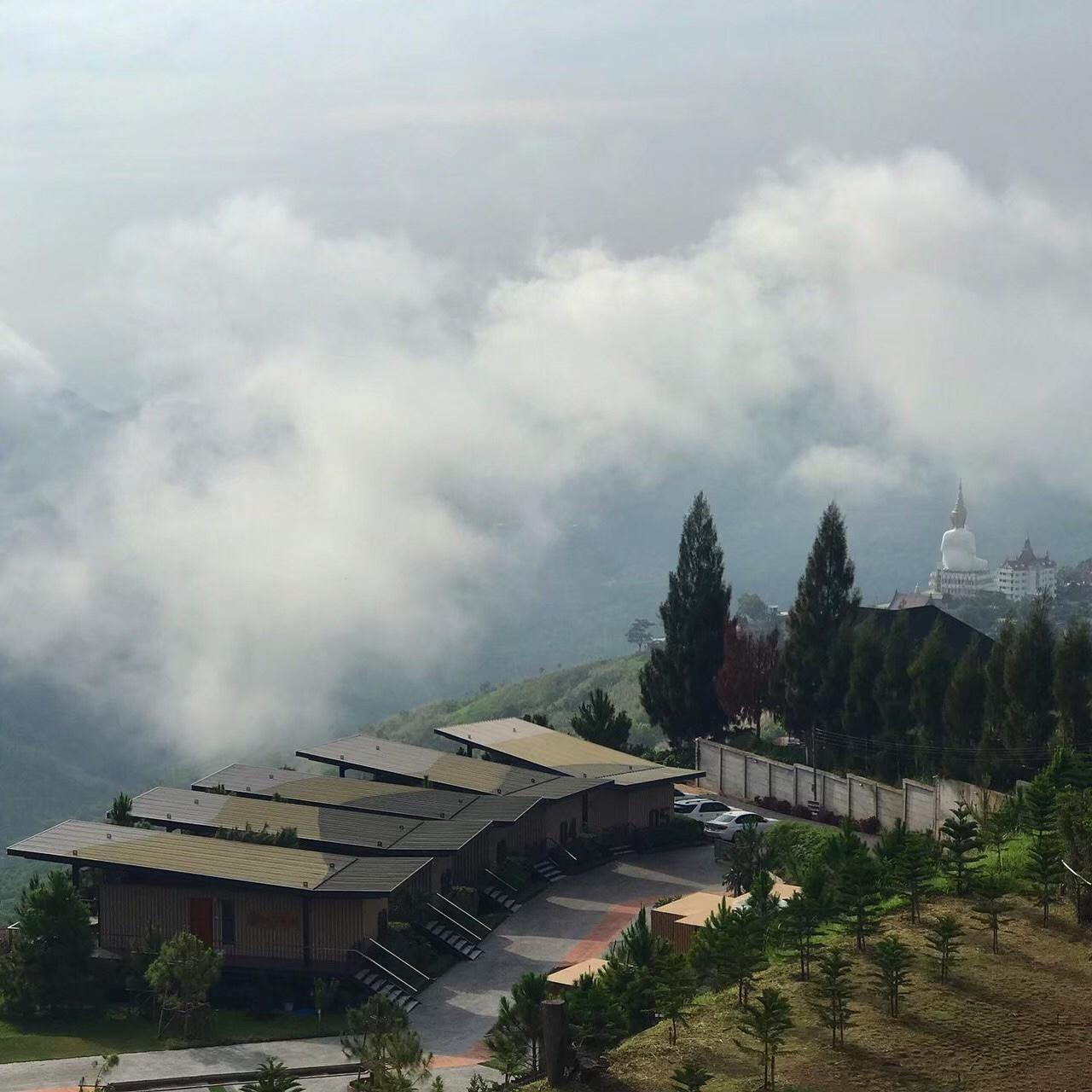 На рассвете кофе и завтрак над обрывом 540 м, откуда открываются великолепные виды на горы и храмовый комплекс Wat Phrathat Pha Sorn Kaew