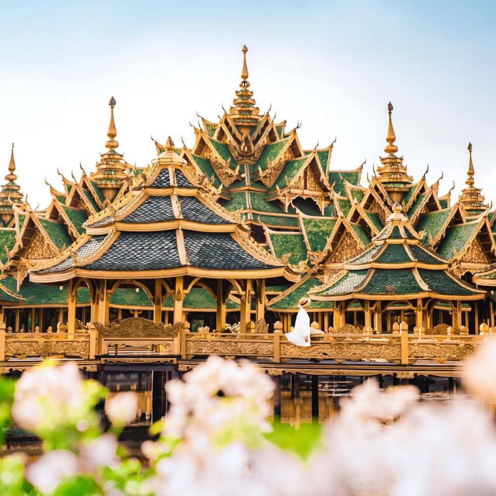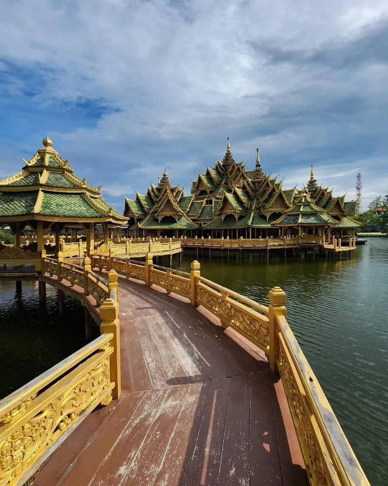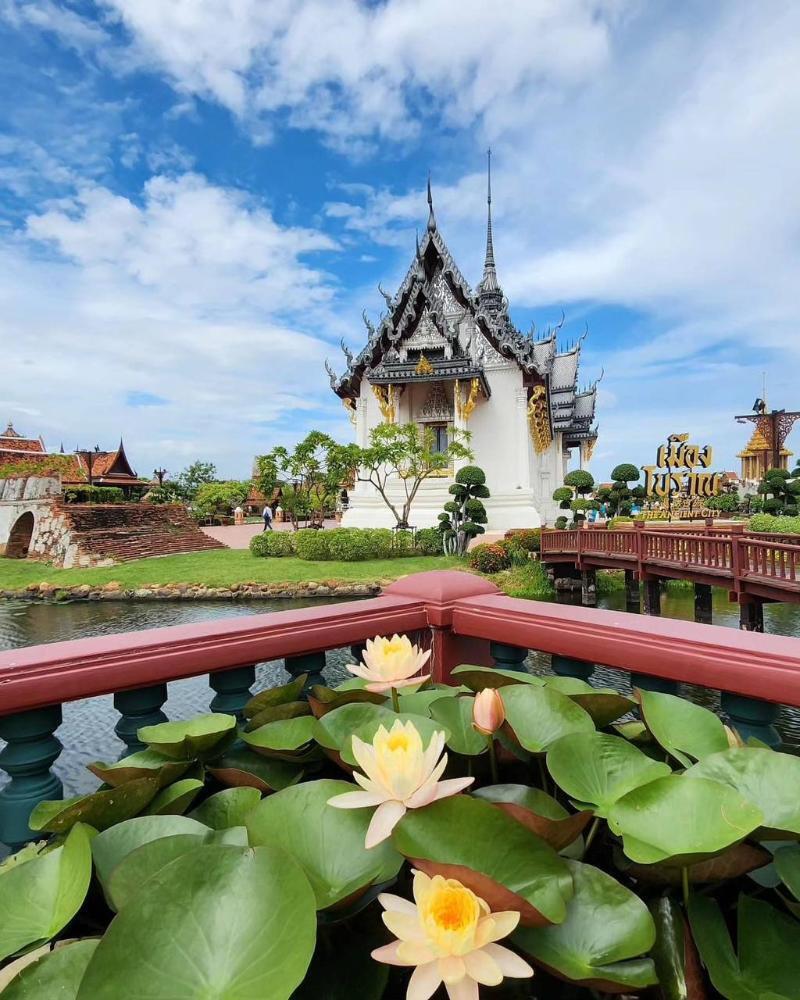 Строительство парка началось в 1960-х и продолжается до сих пор — десятки храмов, дворцов и исторических зданий в натуральную величину. Внутри парка — плавучий рынок с тайской едой, где можно пообедать на воде.